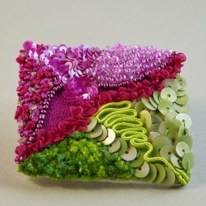 J’ai utilisé des perles anciennes, des paillettes et cuvettes variées, des rubans d’organza et de soie, de la rayonne, du mouliné, de la soutache et de la chenille.